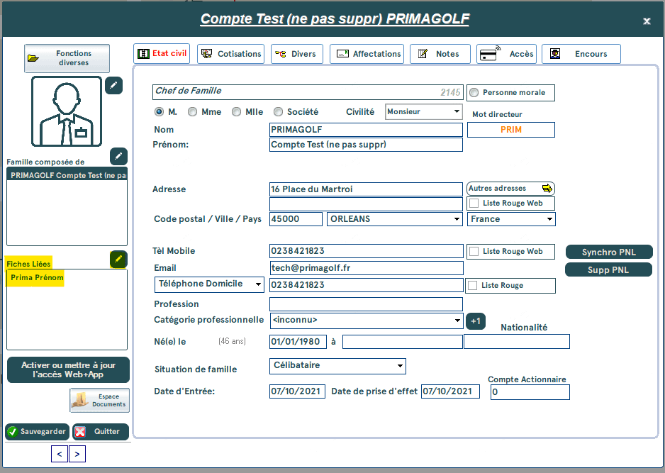 Cette nouvelle fonctionnalité vous permet de créer des liaisons entre des fiches, par exemple pour un couple qui souhaite payer chacun sa part. Ainsi, ils ne seront plus sous le format famille, mais en tant que fiches reliées.